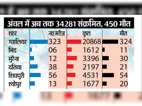 अंचल के भिंड, मुरैना, श्योपुर, शिवपुरी और दतिया में 125 नए संक्रमित मिले हैं। इसके साथ ही दतिया जिले में दो कोरोना संक्रमण के कारण दो लोगों की मौत हो गई। मृतकों में एक दतिया का और दूसरा निवाड़ी का रहने वाला था। जानकारी के मुताबिक निवाड़ी के रहने वाला बुजुर्ग आदित्य नारायण खरे (88) ने गुरुवार को देर रात इलाज के दौरान दम तोड़ दिया।