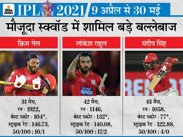 पंजाब की बात करें, तो टीम में बिग हिटर्स की भरमार है। टीम में पिछले सीजन के औरेंज कैप विजेता लोकेश राहुल और मयंक अग्रवाल जैसे ओपनर्स हैं। राहुल ने पिछले सीजन में 670 रन बनाए थे। वहीं, मयंक ने 424 रन बनाए थे। इसके बाद यूनिवर्सल बॉस क्रिस गेल बैटिंग के लिए आएंगे। जरूरत पड़ी तो इसे रोटेट भी किया जा सकता है। मिडिल ऑर्डर में विकेटकीपर बैट्समैन निकोलस पूरन चौथे नंबर पर अपनी आक्रमक बल्लेबाजी से किसी भी गेंदबाज की लाइन-लेंथ बिगाड़ सकते हैं।