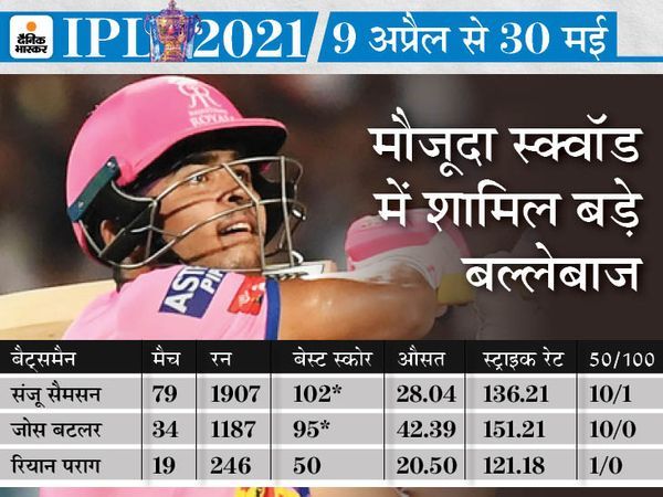 राजस्थान की बात करें तो टीम की बैटिंग लाइनअप बेहद मजबूत है। टीम के पास टॉप ऑर्डर में जोस बटलर और यशस्वी जायसवाल जैसे बल्लेबाज हैं। वहीं, सैमसन IPL की खोज रहे हैं। इसके बाद रियान पराग, बेन स्टोक्स और राहुल तेवतिया जैसे बल्लेबाजों की मौजूदगी से टीम को मजबूती मिलेगी। IPL ऑक्शन के सबसे महंगे प्लेयर मॉरिस फिनिशर का रोल निभाते नजर आएंगे।