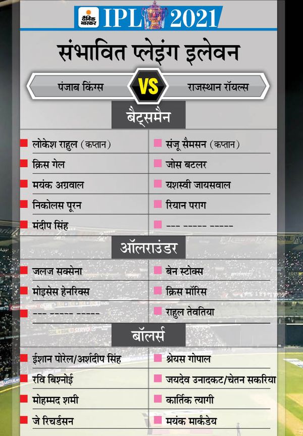 IPL 2021 सीजन का चौथा मैच पंजाब किंग्स और राजस्थान रॉयल्स के बीच मुंबई के वानखेड़े स्टेडियम में खेला जाएगा। यह मैच आज शाम 7:30 बजे से शुरू होगा। राजस्थान की टीम इंग्लिश तेज गेंदबाज जोफ्रा आर्चर के बिना मैदान पर उतरेगी। वे फिलहाल चोटिल हैं। ऐसे में RR की पेस बॉलिंग की कमान 16 करोड़ के क्रिस मॉरिस और भारतीय तेज गेंदबाजों के हाथों में होगी।