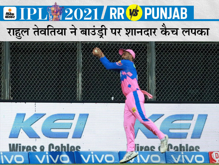 राहुल तेवतिया ने बाउंड्री पर लोकेश राहुल का शानदार कैच लपका।