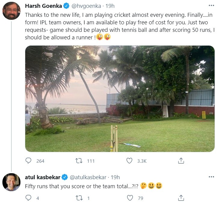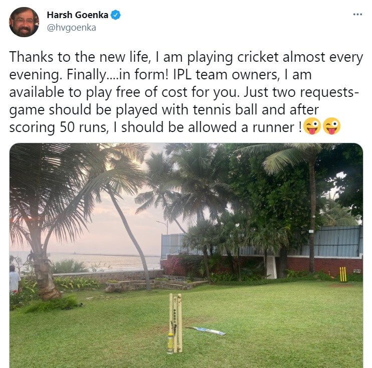 63 साल के उद्योगपति गोयनका ने लिखा कि नई जिंदगी के लिए शुक्रिया, मैं हर शाम को क्रिकेट खेल रहा हूं. लगता है कि फॉर्म में आ गया हूं. आईपीएल टीम ओनर्स, मैं आपके लिए फ्री में खेलने को तैयार हूं. लेकिन बस दो अनुरोध- पहला ये कि मुकाबला टेनिस बॉल से होना चाहिए और दूसरा 50 रन बनाने के बाद मुझे एक रनर लेने की अनुमति दी जाए. उनके इस ट्वीट पर फैंस और कई सेलिब्रिटीज ने मजेदार कमेंट किए. एक यूजर ने लिखा कि आपके मैदान के पास समुद्र नजर आ रहा है. ऐसे में अगर किसी ने गेंद समुद्र की तरफ मारी, तो उसे कौन लेकर आएगा?. या आपको कोई फर्क नहीं पड़ेगा और नई बॉल से मैच दोबारा शुरू हो जाएगा.