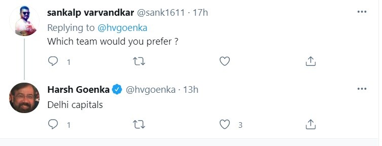 एक ट्विटर यूजर ने हर्ष गोयनका से जब ये पूछा कि आप कौन सी आईपीएल टीम से खेलेंगे, तो उन्होंने दिल्ली का नाम लिया. (Sanaklp Varvandkar twitter)