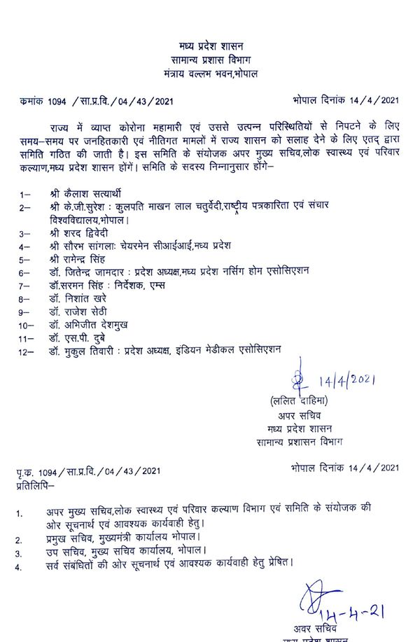 समिति में इंडियन मेडिकल एसोसिएशन के प्रदेश अध्यक्ष डाॅ. मुकुल तिवारी के अलावा शरद द्विवेदी, रामेंद्र सिंह, डाॅ. निशांत खरे, डाॅ. राजेश सेठी, डाॅ. अभिजीत देशमुख और डाॅ. एसपी दुबे को सदस्य बनाया गया है। समिति के संयोजक अपर मुख्य सचिव स्वास्थ्य मोहम्मद सुलेमान को बनाया गया है।