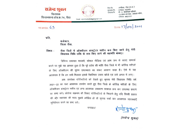 बता दें कि राजेंद्र शुक्ल ने ऑक्सीजन कंसर्टेड मशीन की कमी को देखते हुए एवं अन्य उपकरण विधायक निधि से खरीदने के लिए रीवा कलेक्टर इलैया राजा टी को सहमति पत्र सौंपा। उक्त पत्र में लिखा है कि कोरोना संक्रमण एवं उपचार के लिए जितनी राशि की आवश्यकता हो, वे विधायक निधि से ले ले। लेकिन उपचार में कोई कमी ना आने पाए। यह सुनिश्चित किया जाए।