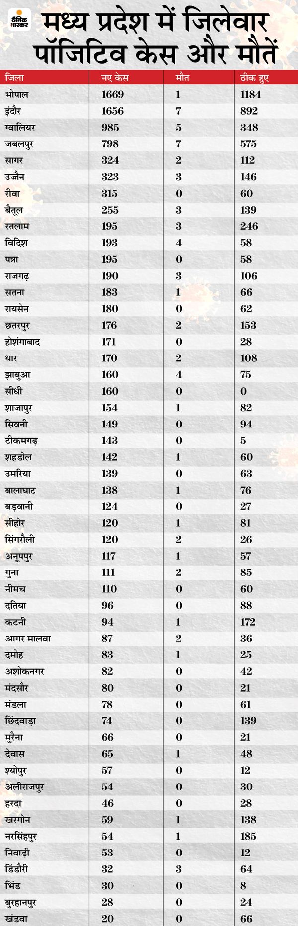 कोरोना के मामले में देश के टॉप 10 शहरों में मध्य प्रदेश के दो शहर भोपाल और इंदौर शामिल हो गए हैं। इस सूची मे भी भोपाल, इंदौर से ऊपर है। पिछले 30 दिनों में प्रति 10 लाख आबादी पर भोपाल में 7,359 केस मिले हैं। जबकि इंदौर में यह आंकड़ा 7,027 है। इस लिहाज से नासिक, नागपुर, पुणे, मुंबई, बंगलुरु के बाद छटवें व सातवें नंबर पर भोपाल और इंदौर है।