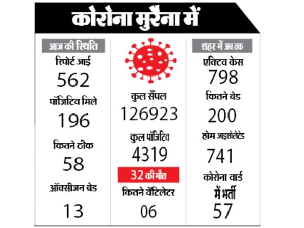 काेराेना संक्रमित मरीजाें की संख्या में लगातार इजाफा हो रहा है। सोमवार को 562 सैंपल की जांच में 196 पॉजिटिव मिले हैं। इसमें 140 आरटी-पीसीआर जांच में संक्रमित पाए गए हैं और 56 पॉजिटिव रेपिड एंटीजन किट से हुई जांच में निकले हैं। एक युवक की कोरोना से मौत हो गई। सोमवार को हालत बिगड़ने पर 8 मरीजों को ग्वालियर रेफर कर दिया गया। जिन मरीजों को रेफर किया गया, उन्हें ग्वालियर में अस्पताल में भर्ती होने में पांच से छह घंटे भटकना पड़ा।