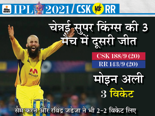 चेन्नई सुपरकिंग्स (CSK) ने IPL 2021 में सोमवार को राजस्थान रॉयल्स (RR) को 45 रनों से हरा दिया। CSK सीजन में दूसरी जीत के साथ पॉइंट टेबल में दूसरे स्थान पहुंच गई। मैच में सबसे अहम रोल अदा किया ड्यू फैक्टर ने। दूसरी पारी में ओंस की वजह से ही राजस्थान के कप्तान संजू सैमसन ने टॉस जीतकर गेंदबाजी का फैसला किया, जिससे चेज करना आसान हो सके। लेकिन मुंबई में मैच के दौरान ओस नहीं पड़ी और मोइन अली और रविंद्र जडेजा ने राजस्थान की आधी टीम पवेनियन लौटा दी। इसमें भी जोस बटलर (49) का विकेट टर्निंग पॉइंट रहा। जडेजा की बॉल पर उनके बोल्ड होते ही चेन्नई मैच पर हावी हो गई। चलिए जानते हैं, उन सभी फैक्टर्स के बारे में, जिनकी बदौलत CSK ने राजस्थान पर जीत दर्ज की।