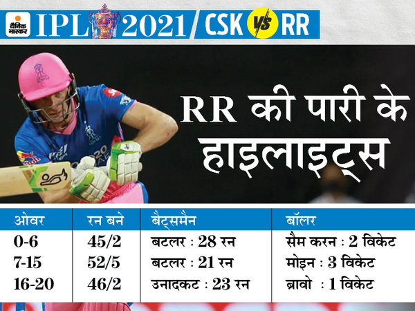 चेन्नई के ऑलराउंडर्स मोइन और जडेजा ने 4 ओवर के अंदर मैच पलट कर रख दिया। इन दोनों ने 12 से 15वें ओवर के बीच राजस्थान के 5 खिलाड़ियों को पवेलियन भेजा। जडेजा ने 12वें ओवर में जोस बटलर और शिवम दुबे को आउट किया। इसके बाद मोइन ने 13वें ओवर में डेविड मिलर और 15वें ओवर में रियान पराग और क्रिस मॉरिस को पवेलियन भेजा। इस दौरान राजस्थान सिर्फ 8 रन ही बना सकी। जडेजा ने 2 विकेट के साथ 4 शानदार कैच भी लपके। उन्होंने मनन वोहरा, रियान, मॉरिस और उनादकट का कैच लिया।