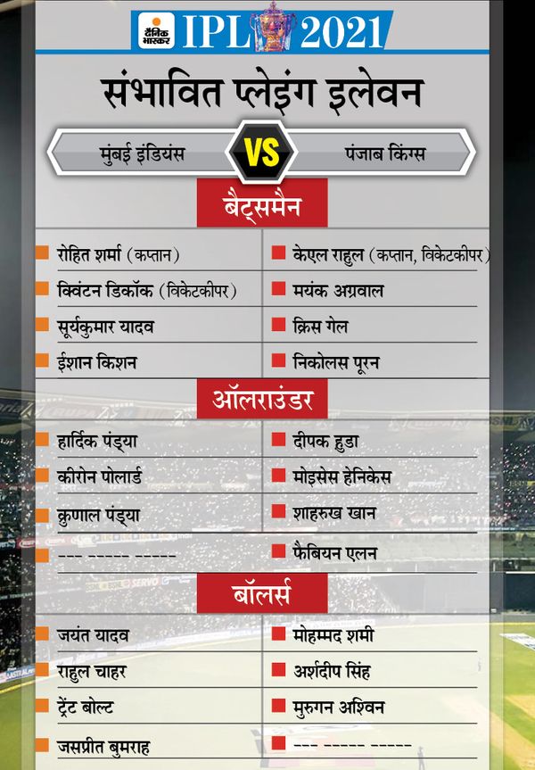 इंडियन प्रीमियर लीग (IPL 2021) का 17वां मुकाबला मुंबई इंडियंस (MI) और पंजाब किंग्स (PBKS) के बीच चेन्नई में थोड़ी देर में खेला जाएगा। मुंबई के तेज गेंदबाज जसप्रीत बुमराह अपनी टीम के लिए 100वां मैच खेलने उतरेंगे। वहीं, पंजाब टीम के कप्तान लोकेश राहुल अपने साथ क्रिस गेल से ओपनिंग करा सकते हैं। मयंक अग्रवाल नंबर-3 पर खेलने उतर सकते हैं।