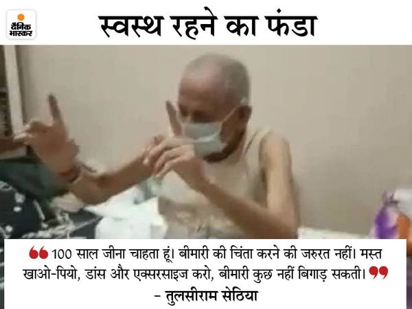 बालाघाट के रहने वाले 92 साल के बुजुर्ग तुलसीराम सेठिया ने नाचते-गाते कोरोना से जंग जीत ली। वे कोरोना पॉजिटिव हुए। घर पर ही क्वारैंटाइन रहे। इस दौरान एक्सरसाइज की, म्यूजिक की धुन पर थिरकते रहे और परिवार के साथ मस्ती करते रहे। बालाघाट के 92 साल के बुजुर्ग की कोरोना रिपोर्ट करीब 14 दिन पहले पॉजिटिव आई थी। उन्हें ज्यादा समस्या नहीं होने पर घर में मौजूद बड़े कमरे में आइसोलेट कर दिया गया। बीमारी को लेकर आ रही नकारात्मक खबरों ने परिवार की भी चिंता बढ़ा दी। इस बीच जीने की ललक और अपने बिंदास अंदाज से तुलसीराम हिम्मत बांधे रखे। परिवार के लोगों ने भी उनका हौसला बढ़ाया। सोशल मीडिया पर तुलसीराम सेठ ए नाम के बुजुर्ग का वीडियो वायरल हो रहा है। तीन दिन पहले उन्होंने दोबारा सैंपल दिया। इसके बाद रिपोर्ट निगेटिव आई।
