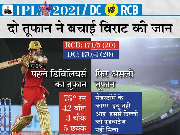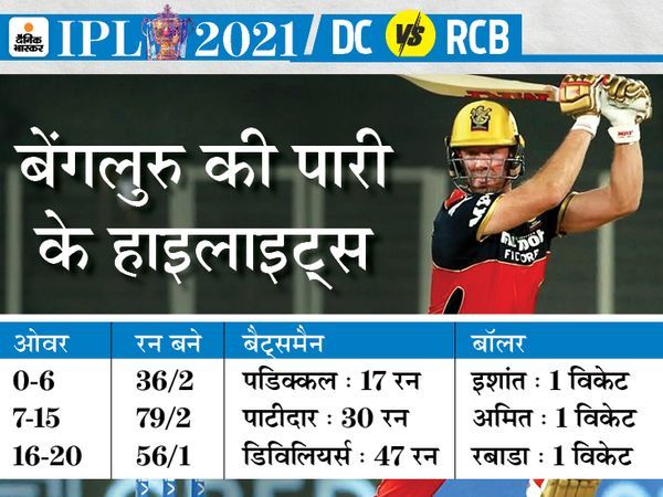 दिल्ली के लिए कगिसो रबाडा का फ्लॉप शो भी हार की एक वजह रही। रबाडा ने अपने 4 ओवरों में 38 रन दिए। उन्हें एकमात्र विकेट अपने स्पेल की आखिरी बॉल पर मिला। वो भी वॉशिंगटन सुंदर का। डिविलियर्स ने तो उनकी बॉल पर जमकर शॉट खेले और बेंगलुरु को 171 रन तक पहुंचाया।