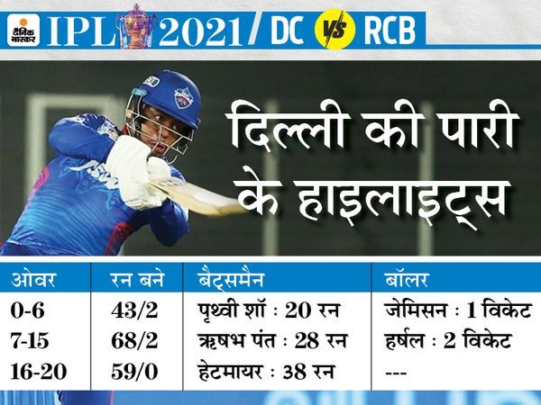 खराब शुरुआत के बाद शिमरॉन हेटमायर ने पंत के साथ दिल्ली की पारी संभाली। इन दोनों ने तेजी से रन बनाए। आखिरी 5 ओवर में दिल्ली को 61 रन की जरूरत थी। 18वें ओवर में इन दोनों ने 21 रन बनाकर दिल्ली की मैच में वापसी कराई। आखिरी 2 ओवर में दिल्ली को 25 रन बनाने थे, पर हर्षल और सिराज ने दिल्ली को सिर्फ 23 रन ही बनाने दिए। पंत 58 रन और हेटमायर 53 रन बनाकर नॉटआउट रहे।