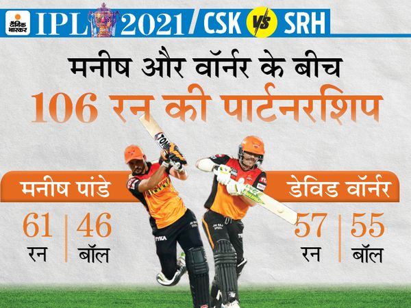 इसके बाद वॉर्नर ने मनीष पांडे के साथ दूसरे विकेट के लिए 83 बॉल पर 106 रन की पार्टनरशिप कर पारी को संभाला।