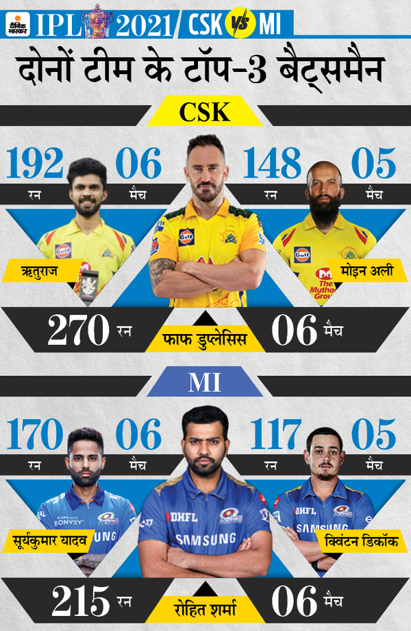 दोनों टीम की बल्लेबाजी देखें तो मुकाबला बराबर का ही लग रहा है। मुंबई के लिए रोहित शर्मा और क्विंटन डिकॉक ओपनिंग करते हैं। जबकि चेन्नई के सलामी बल्लेबाज ऋतुराज गायकवाड़ और फाफ डुप्लेसिस हैं। ये चारों ही फॉर्म में हैं। डुप्लेसिस ऑरेंज कैप की रेस में दूसरे नंबर पर हैं।