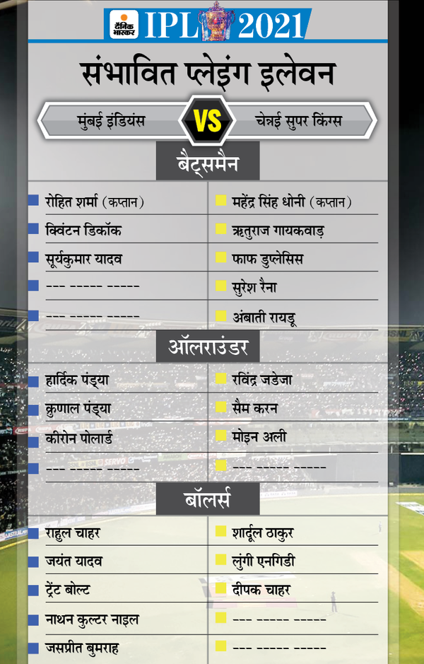 IPL में आज महेंद्र सिंह धोनी की कप्तानी वाली चेन्नई सुपर किंग्स (CSK) और रोहित शर्मा की कप्तानी वाली मुंबई इंडियंस (MI) के बीच कड़ा मुकाबला होगा। 14वें सीजन का यह 27वां मैच दिल्ली के अरुण जेटली स्टेडियम में शाम 7.30 बजे से खेला जाएगा। इस मैदान पर ये दोनों टीमें 7 साल बाद आमने-सामने होंगी। यहां दोनों के बीच एक ही मैच (2013) खेला गया, जिसमें चेन्नई ने मुंबई को 48 रन से हराया था।
