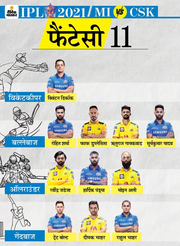 इंडियन प्रीमियर लीग (IPL-2021) में शनिवार को दो दिग्गज टीमों की भिड़ंत होगी। 5 बार की चैम्पियन मुंबई इंडियंस का सामना 3 बार की विजेता चेन्नई सुपरकिंग्स से होगा। चलिए जानने की कोशिश करते हैं कि IPL के अल क्लासिको माने जाने वाले इस मैच में फैंटेसी-11 के लिए कौन-कौन से खिलाड़ी सही चयन साबित हो सकते हैं।