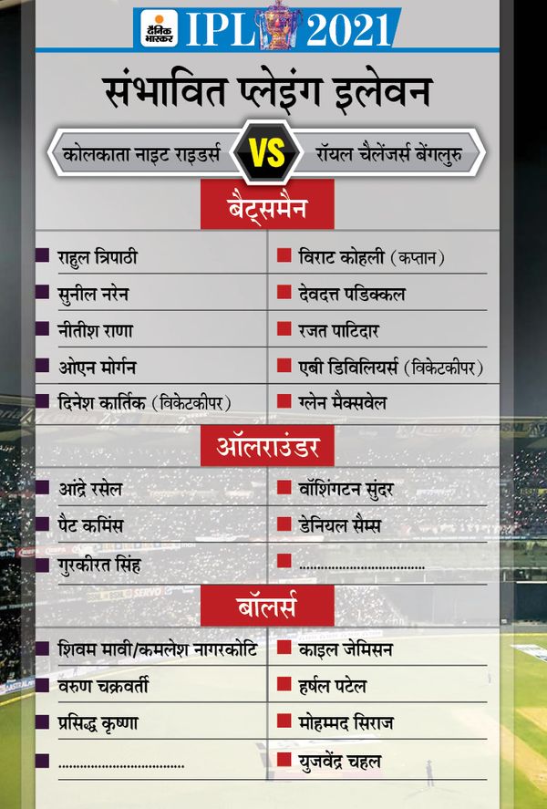 ओपनिंग कॉम्बिनेशन बदल सकती है KKRशुभमन गिल और नीतीश राणा की जोड़ी इस सीजन की सबसे धीमी ओपनिंग जोड़ी में एक रही है। दोनों बल्लेबाजों का स्ट्राइक रेट 120 से कम का रहा है। इसे देखते हुए RCB की टीम ऑपनिंग कॉम्बिनेशन में बदलाव कर सकती है। शुभमन गिल को ड्रॉप किया जा सकता है। वहीं, राहुल त्रिपाठी और सुनील नरेन से ओपनिंग कराई जा सकती है। नीतीश राणा नंबर-3 पर आ सकते हैं।