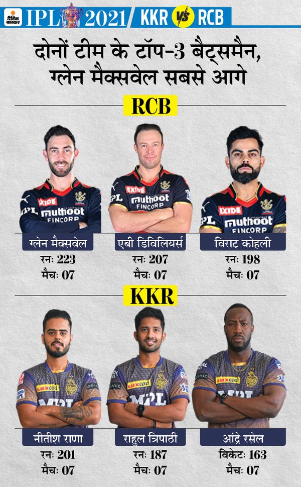 RCB की ओपनिंग जोड़ी दमदारKKR के ओपनर्स भले ही स्ट्रगल कर रहे हैं, RCB के साथ ऐसी कोई परेशानी नहीं है। विराट कोहली और देवदत्त पडिक्कल की ओपनिंग जोड़ी ने 9.66 रन प्रति ओवर की दर से रन बनाए हैं। साथ ही इस जोड़ी का औसत भी 55.83 का रहा है। उनकी कामयाबी से ग्लेन मैक्सवेल और एबी डिविलियर्स को मजबूत बुनियाद मिली होती है।