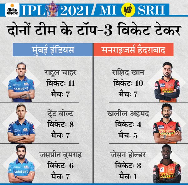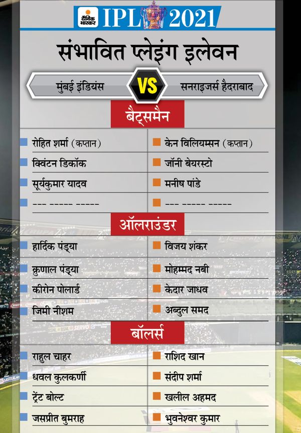 मुंबई टीम यह मैच जीती तो पॉइंट टेबल के टॉप-3 में पहुंच जाएगी। फिलहाल टीम चौथे नंबर पर काबिज है। वहीं, 7 मैच में एक जीत के साथ सनराइजर्स टीम पॉइंट टेबल में सबसे नीचे यानी 8वें नंबर पर है। अब यदि टीम को प्ले-ऑफ में पहुंचने की उम्मीदें बरकरार रखनी हैं, तो बाकी बचे सभी 7 मैच जीतने होंगे। यानी सनराइजर्स टीम के लिए बाकी बचे सभी मैच करो या मरो की तरह हैं।