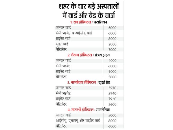 इतना ही नहीं कुछ निजी अस्पतालों में स्थिति यह है कि यदि मरीज शाम 5 बजे से पहले डिस्चार्ज नहीं हुआ और इसके बाद हुआ तो उससे पूरे एक दिन का अतिरिक्त चार्ज लिया जा रहा है। कोविड संक्रमितों को यदि सरकारी अस्पतालों में बेड नहीं मिला और परिजन उन्हें निजी अस्पताल ले गए तो वहां जनरल वार्ड में भी बेड का चार्ज 4 से 5 हजार रुपए है। सागर श्री और राय हॉस्पिटल में 5-5 हजार रुपए, चैतन्य और भाग्योदय में जनरल वार्ड में बेड का चार्ज 4-4 हजार रुपए लिया जा रहा है। तो वहीं सेमी प्राइवेट व आईसीयू में बेड का चार्ज 6 से 7 हजार रुपए और प्राइवेट वार्ड में एक दिन का बेड का चार्ज 8 से 9 हजार रुपए है।