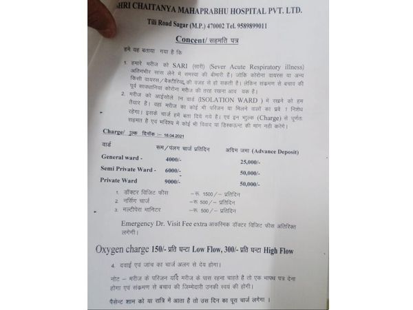 चैतन्य अस्पताल द्वारा एडवांस राशि जमा कराने को लेकर मरीजों के परिजनों से इस तरह सहमति पत्र भरवाया जा रहा है।