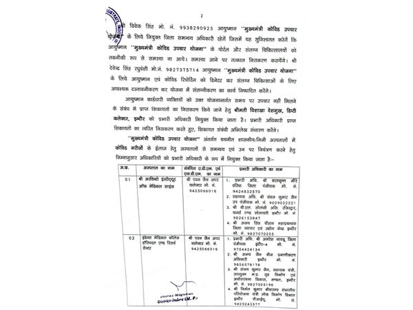 कोविड अस्पतालों में आयुष्मान कार्डधारियों का एडमिशन और उपचार बिना किसी बाधा के आसानी से हो सके, इसके लिए निगम आयुक्त प्रतिभा पाल को नोडल अधिकारी नियुक्त किया जाता है। आदेश के अनुसार, अपर कलेक्टर पवन जैन नियंत्रक अधिकारी रहेंगे। वे नोडल अधिकारी के संपर्क में रहते हुए शिकायत और समस्या का निराकरण करेंगे। इसके अलावा अपर कलेक्टर संतोष टैगोर हॉस्पिटलों को मार्गदर्शन देंगे। इसके अलावा पोर्टल में आने वाली समस्याओं का निराकरण कराएंगे।
