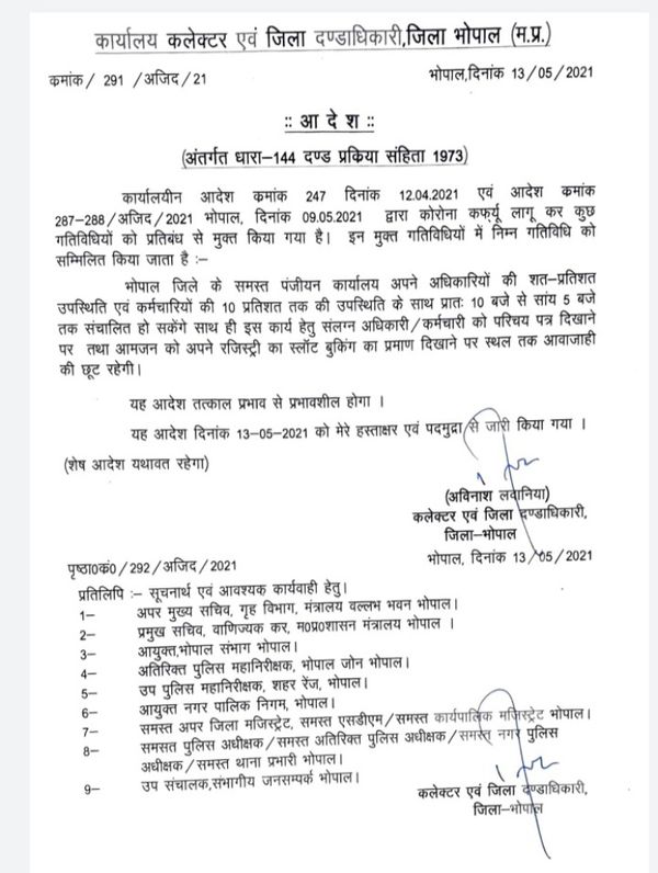 भोपाल कलेक्टर ने पंजीयन कार्यालय खोलने के आदेश जारी किए