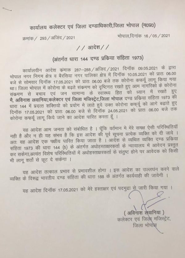 भोपाल में कोरोना कर्फ्यू 7 दिन बढ़ा। अब 24 मई सुबह 6 बजे तक सबकुछ बंद