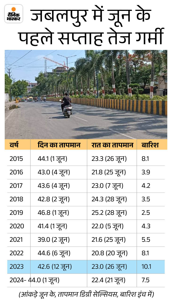 जबलपुर में 10 साल अच्छी बारिश मानसून की एंट्री के साथ ही जबलपुर में अच्छी बारिश होती है। यही से मानसून की एंट्री होती है, इसलिए अन्य जिलों की तुलना में जबलपुर में अच्छा पानी गिरता है। साल 2014 से 2023 तक के आंकड़ों पर नजर डाले तो कोटे की 30% तक बारिश हो चुकी है। पिछले साल 10 इंच से ज्यादा पानी गिरा था। इस बार भी जबलपुर के दक्षिण हिस्से से ही मानसून एंटर हो सकता है।