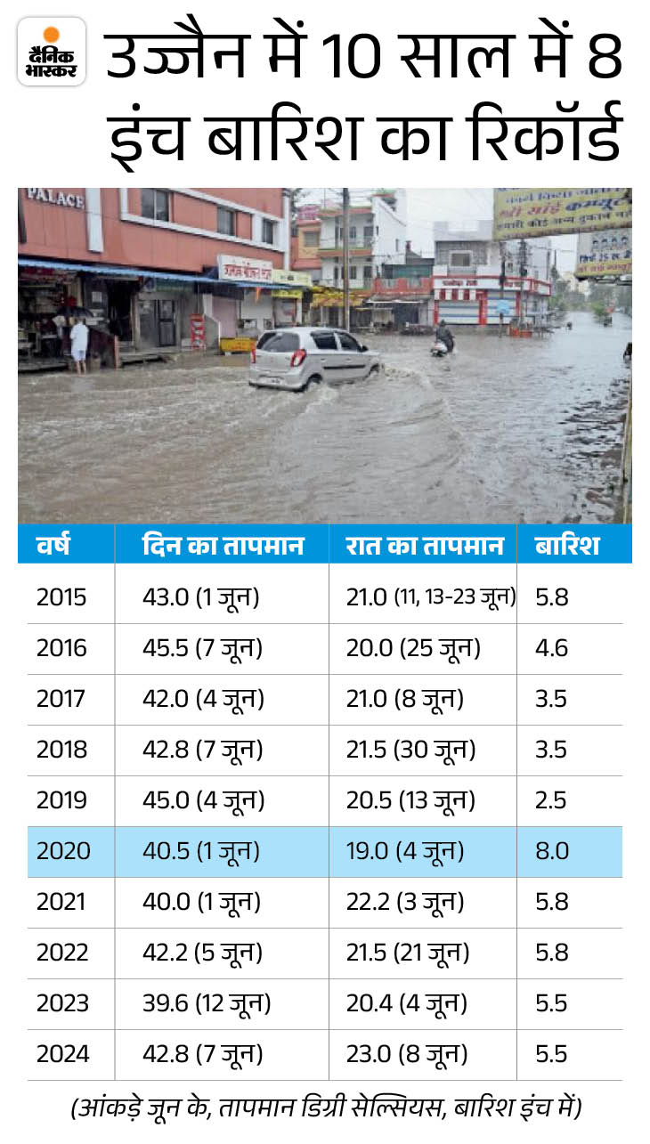 उज्जैन में भी अच्छी बारिश का ट्रेंड जून महीने में उज्जैन में भी अच्छी बारिश होने का ट्रेंड है। 2015 से 2023 के बीच उज्जैन में 2.5 से 8 इंच तक बारिश हो चुकी है। इस बार भी ऐसा ही मौसम रहने का अनुमान है। 20 जून तक यहां मानसून एंटर हो सकता है।