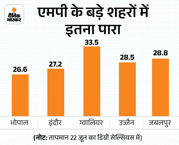 इंदौर में पिछले साल हुई थी 4 इंच बारिश जून में इंदौर में दिन के टेम्प्रेचर में खासी गिरावट होती है। पिछले 5 साल यानी- 2020, 2021, 2022, 2023 और 2024 में जून में कम गर्मी पड़ी। पारा 39.6 से 41.1 डिग्री के बीच रहा है। पिछले साल 40.6 डिग्री तक पारा पहुंचा था। इस महीने कोटे की 20 प्रतिशत तक बारिश हो जाती है। पिछले साल करीब 4 इंच पानी गिरा था।