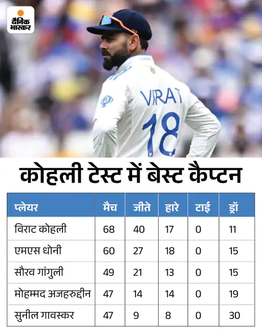 कोहली ने इंडिया के लिए 123 टेस्ट खेले हैं कोहली का टेस्ट करियर शानदार रहा है, जिसमें उन्होंने 123 टेस्ट (210 पारी) में 46.85 की औसत से 9230 रन बनाए। इस दौरान उन्होंने 30 शतक और 31 अर्धशतक लगाए। उन्होंने 68 टेस्ट में कप्तानी की और 40 में जीत हासिल की, जो उन्हें भारत का सबसे सफल टेस्ट कप्तान बनाता है। उनकी जीत का प्रतिशत 58.82 है, जो 50 या अधिक टेस्ट में कप्तानी करने वालों में तीसरा सबसे बेहतर है।