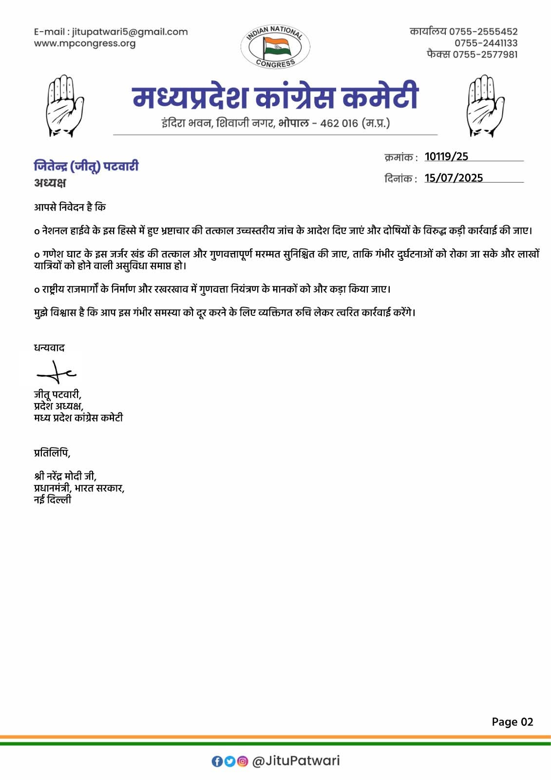 जीतू पटवारी ने केंद्रीय मंत्री गडकरी को पत्र लिखा है।