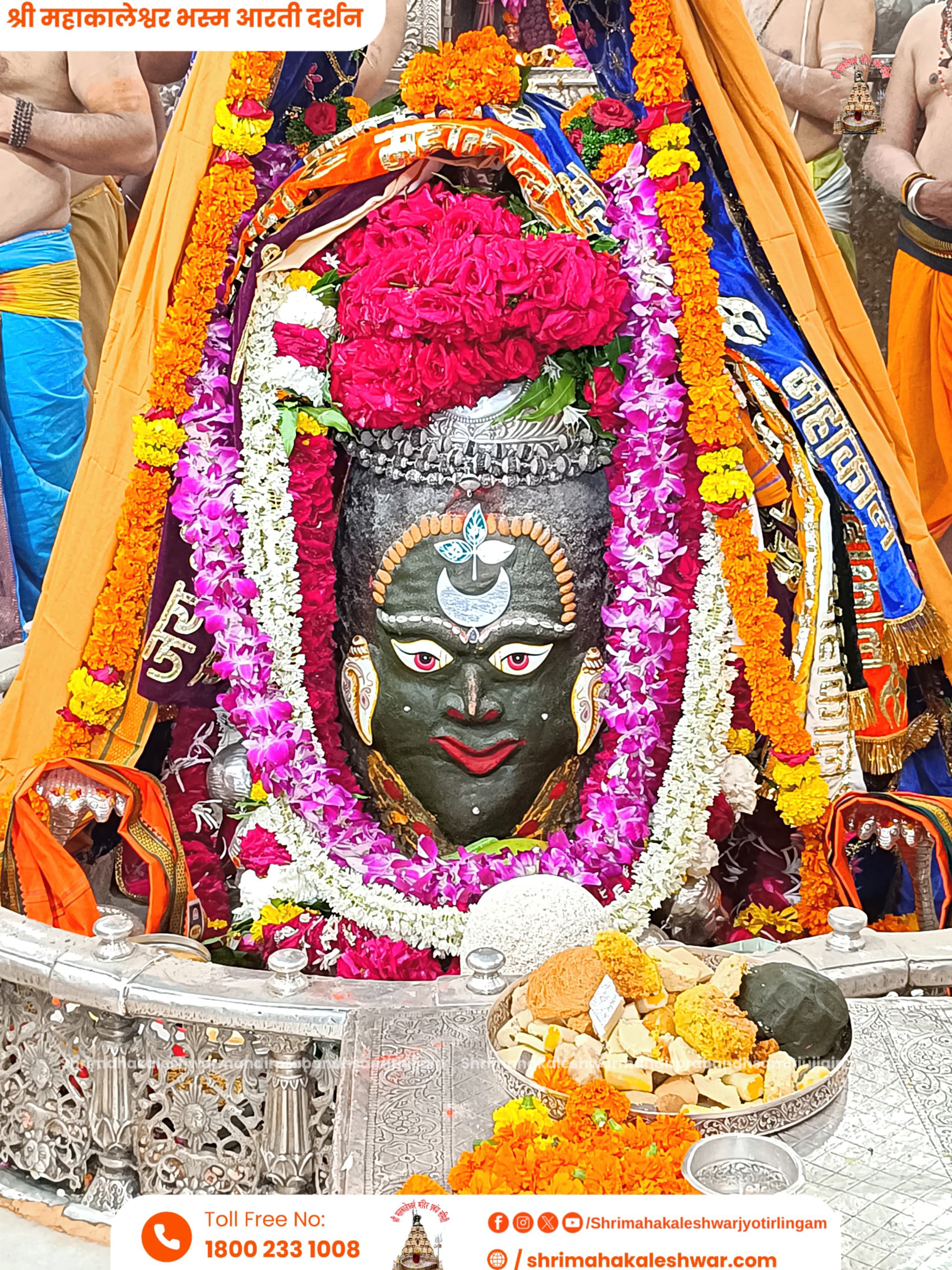 भगवान महाकाल का भांग, ड्रायफ्रूट और आभूषण के साथ फूलों से राजा स्वरूप में श्रृंगार किया गया। भस्म अर्पित करने के बाद शेषनाग का रजत मुकुट, रजत की मुण्डमाल और रुद्राक्ष की माला के साथ सुगन्धित पुष्प से बनी माला अर्पित की। भगवान महाकाल ने गुलाब के सुगंधित पुष्प धारण किए।