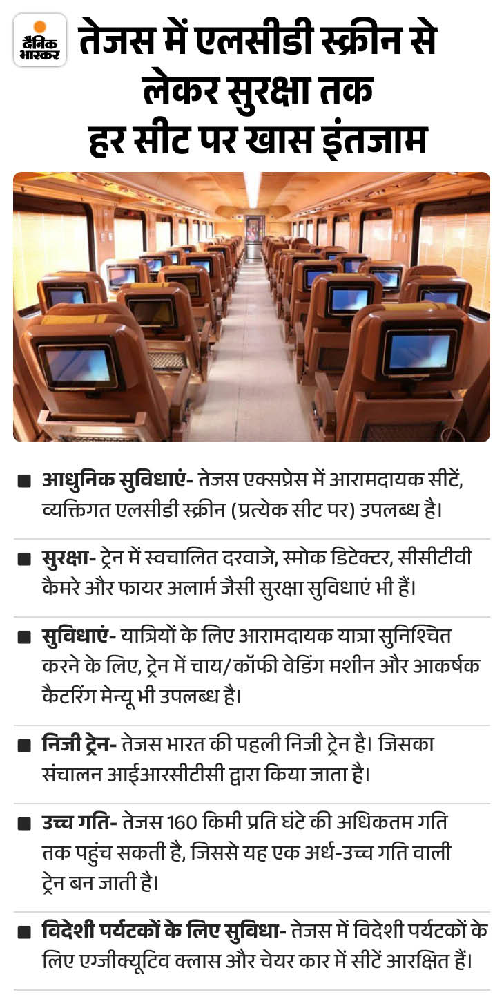 देश की पहली प्राइवेट तेजस ट्रेन की खासियत तेजस ट्रेन, भारतीय रेलवे की एक अर्ध-उच्च गति वाली, पूरी तरह से वातानुकूलित ट्रेन है, जो आधुनिक सुविधाओं से लैस है। इसमें स्वचालित दरवाजे, आरामदायक सीटें, एलसीडी स्क्रीन, वाई-फाई और बायो-वैक्यूम शौचालय जैसी सुविधाएं उपलब्ध हैं। यह देश की पहली निजी और कॉर्पोरेट ट्रेन है, जिसका संचालन आईआरसीटीसी करती है।