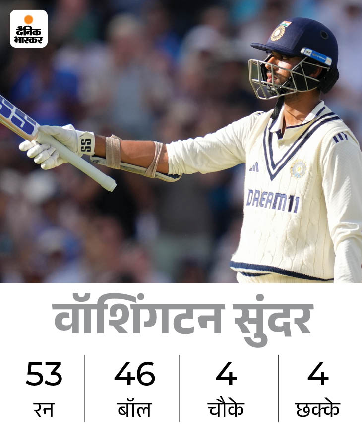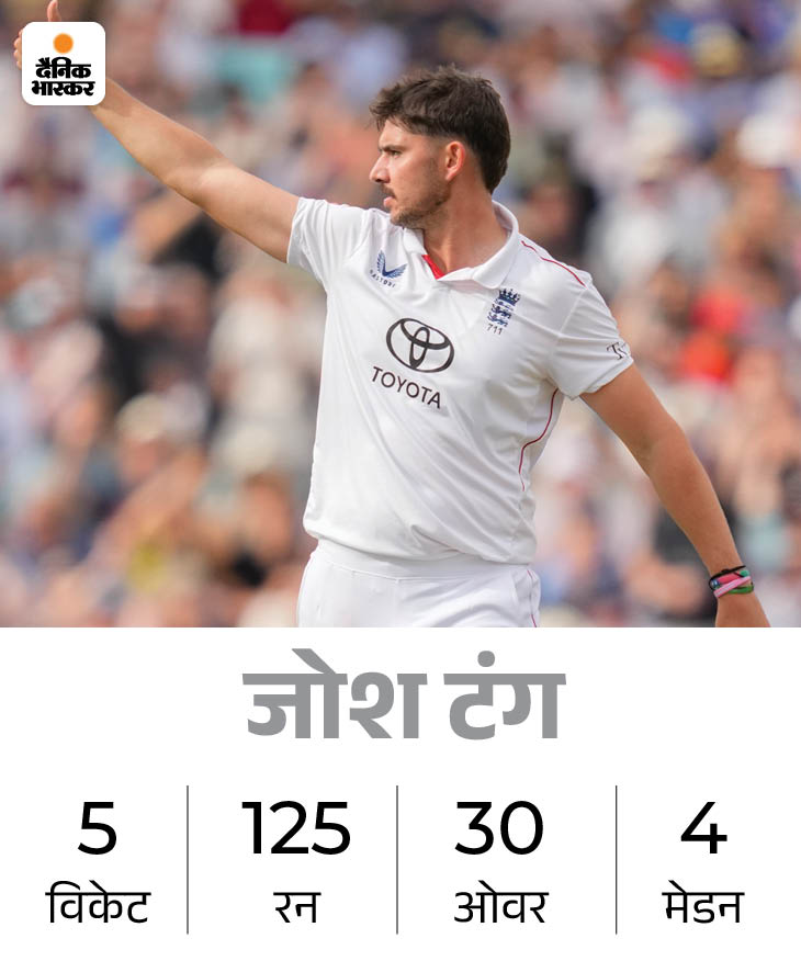 जडेजा 53 रन बनाकर आउट हुए। उनके बाद मोहम्मद सिराज खाता भी नहीं खोल सके। वॉशिंगटन सुंदर ने आखिर में 53 रन बनाकर बढ़त 373 तक पहुंचा दी। इंग्लैंड से जोश टंग ने 5 और गस एटकिंसन ने 3 विकेट लिए। जैमी ओवर्टन को 2 विकेट मिले।