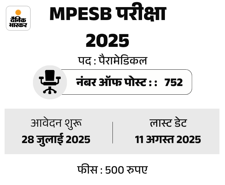मध्य प्रदेश कर्मचारी चयन बोर्ड यानी MPESB ने ग्रुप-5 संयुक्त भर्ती परीक्षा (CRE) 2025 के तहत 752 पैरामेडिकल पदों पर भर्ती निकाली है। उम्मीदवार मध्य प्रदेश कर्मचारी चयन बोर्ड की वेबसाइट esb.mp.gov.in पर जाकर अप्लाई कर सकते हैं। इस भर्ती के लिए परीक्षा का आयोजन 27 सितंबर को किया जाएगा।