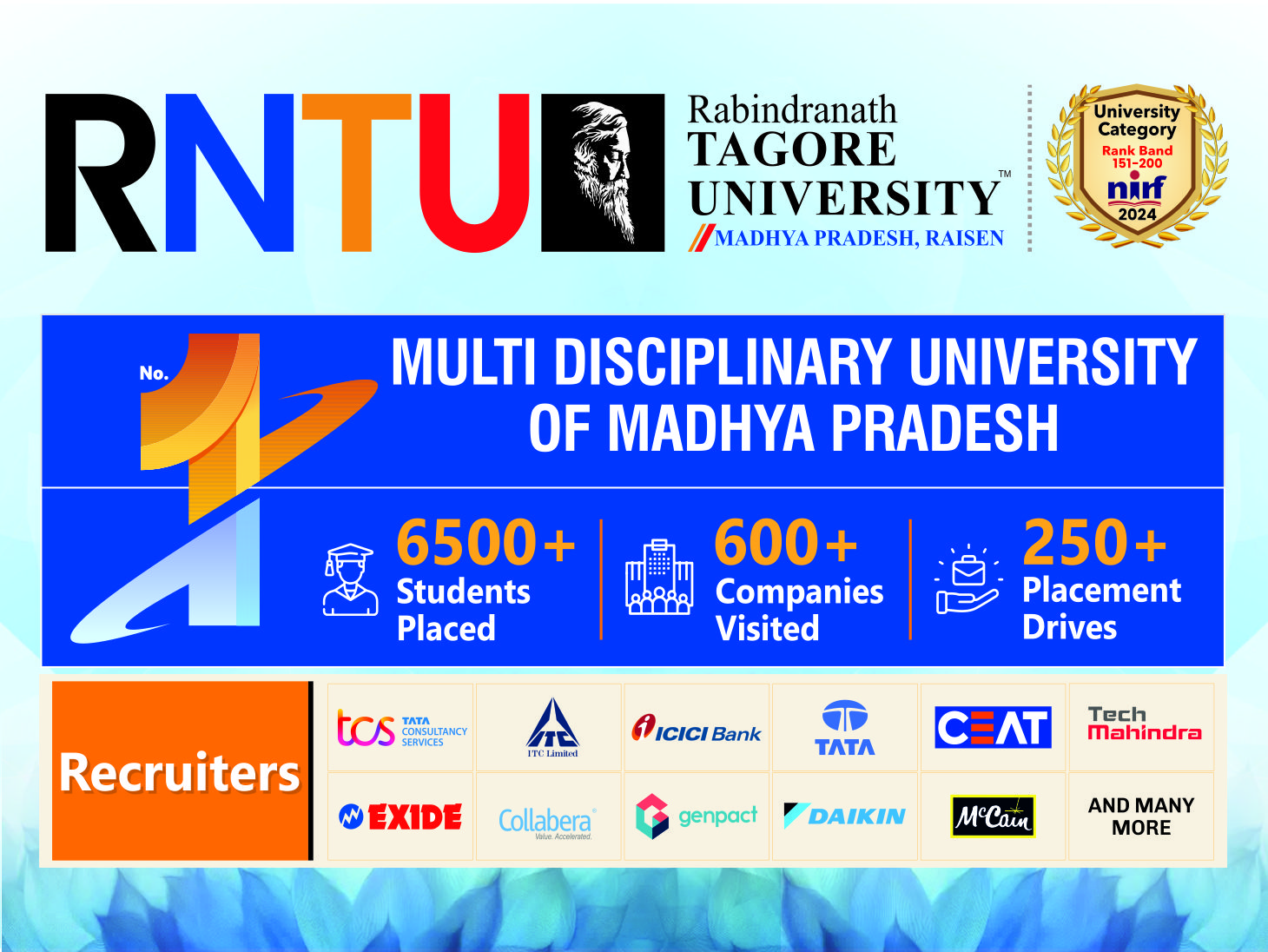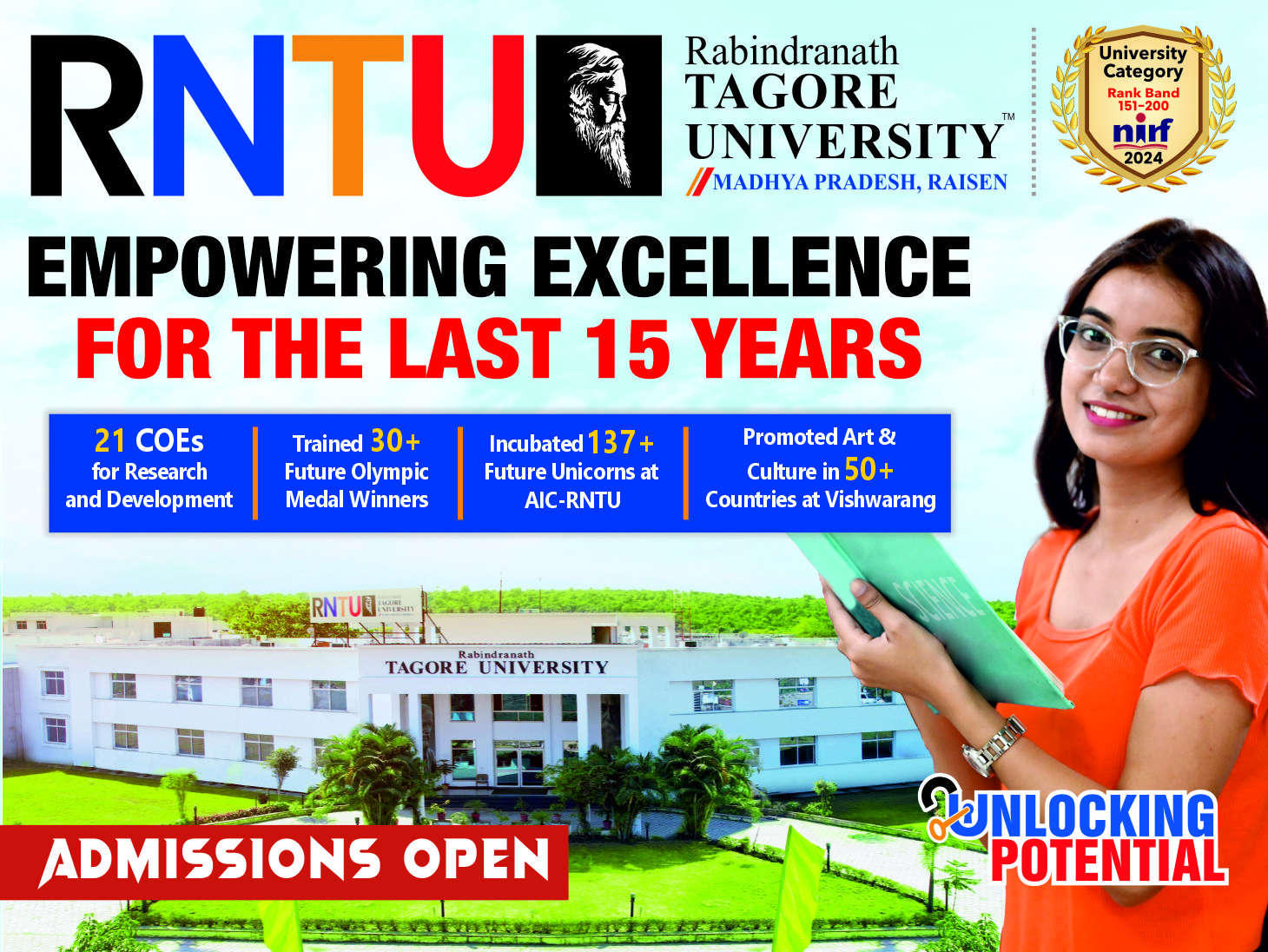 15 वर्षों से शिक्षा में उत्कृष्टता का प्रतीक, रवींद्रनाथ टैगोर विश्वविद्यालय (RNTU) भोपाल ने 2025–26 सत्र के लिए प्रवेश की घोषणा कर दी है। मध्यप्रदेश का पहला निजी विश्वविद्यालय, RNTU लगातार 6 वर्षों से NIRF रैंकिंग में शामिल है और NAAC से मान्यता प्राप्त है। साथ ही विश्वविद्यालय को UaGC, AICTE, NCTE, BCI, INC, MP Paramedical Council और MP Nursing Council जैसे प्रमुख निकायों से भी अनुमोदन प्राप्त है।
