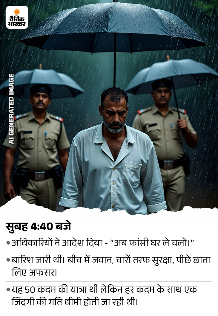 जल्लाद बालकृष्ण राव तैयार था। थुलथुल शरीर, सफेद बड़ी मूंछें, हाथ में रूमाल। रस्सी को जांचता, लीवर की सफाई करता और तीन बार प्रणाम करता। मानो कोई पूजा वैदिक रीति से संपन्न कर रहा हो। उधर, उमाशंकर के पैरों में 25 किलो बालू की पोटली बांधी जा चुकी थी, क्योंकि फांसी में वजन का संतुलन जरूरी होता है। उसके चेहरे पर गहरा नीला नकाब बांधा जा चुका था। सब कुछ तैयार था।