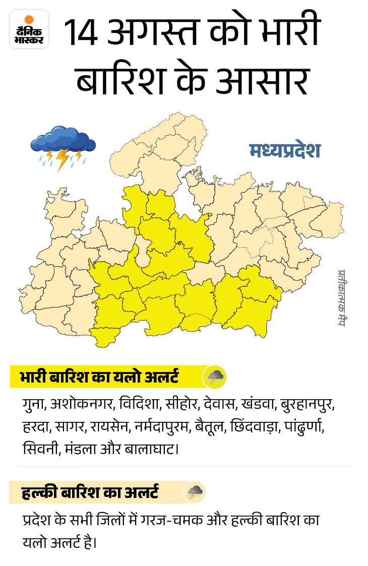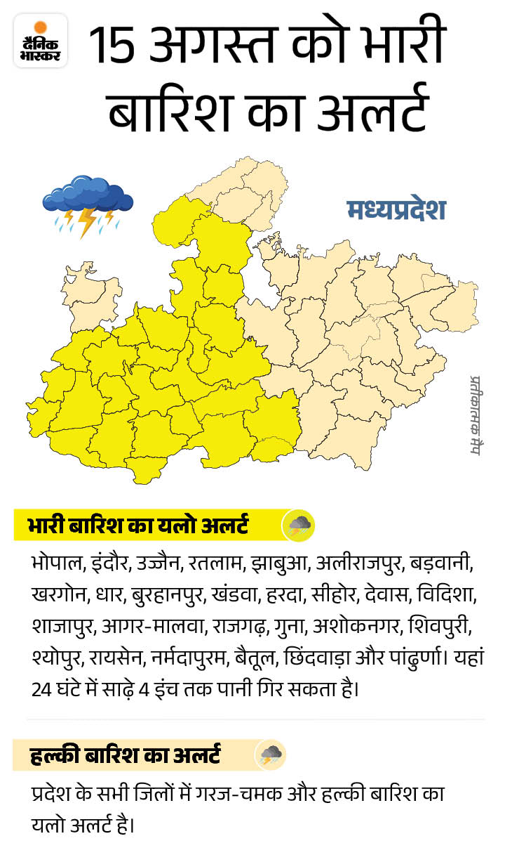 मौसम विभाग के अनुसार, 15 अगस्त से बारिश का स्ट्रॉन्ग सिस्टम एक्टिव हो रहा है। इसकी वजह से पूरे प्रदेश में फिर से तेज बारिश शुरू हो सकती है। इससे पहले भी तेज बारिश होने का अलर्ट है। बुधवार को सीहोर, हरदा, रायसेन, नर्मदापुरम, बैतूल, नरसिंहपुर, छिंदवाड़ा, पांढुर्णा, सिवनी, अनूपपुर, डिंडौरी, मंडला और बालाघाट में भारी बारिश होने की चेतावनी दी गई है। यहां अगले 24 घंटे में साढ़े 4 इंच तक पानी गिर सकता है।
