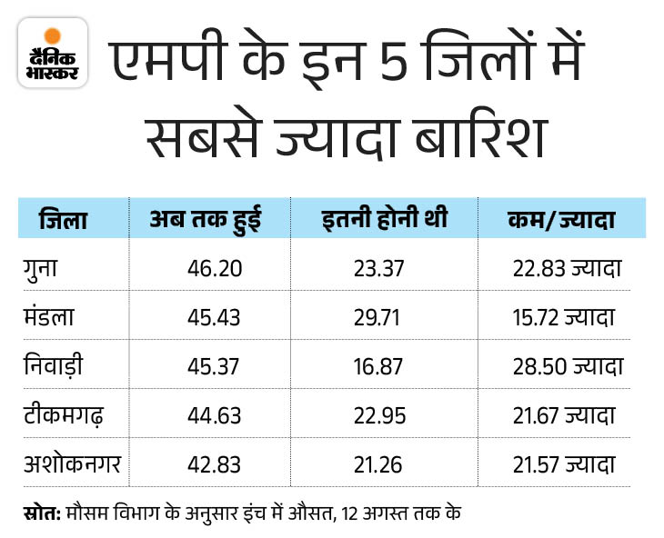 गुना में सबसे ज्यादा पानी गिरा, इंदौर सबसे पीछे इस बार सबसे ज्यादा पानी गुना में गिरा है। यहां 46 इंच बारिश हो चुकी है। निवाड़ी में 45.4 इंच, मंडला-टीकमगढ़ में 45 इंच और अशोकनगर में 42.8 इंच के करीब बारिश हो चुकी है। विदिशा, जबलपुर, नरसिंहपुर, बालाघाट, डिंडौरी, सागर, पन्ना, श्योपुर, सिंगरौली, सीधी, नर्मदापुरम और उमरिया में 30 इंच से ज्यादा बारिश हो चुकी है। इंदौर संभाग में कम पानी गिरा है।