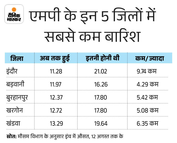 इस मानसूनी सीजन में मध्यप्रदेश में अब तक औसत 29.7 इंच बारिश हो चुकी है, जो कोटे की 79 प्रतिशत है। पिछले 12 दिन से भोपाल, इंदौर, उज्जैन समेत कई जिलों में तेज बारिश का दौर थमा हुआ है। इस वजह से इंदौर-उज्जैन संभाग में सूखे जैसे हाल है। यहां सोयाबीन की फ