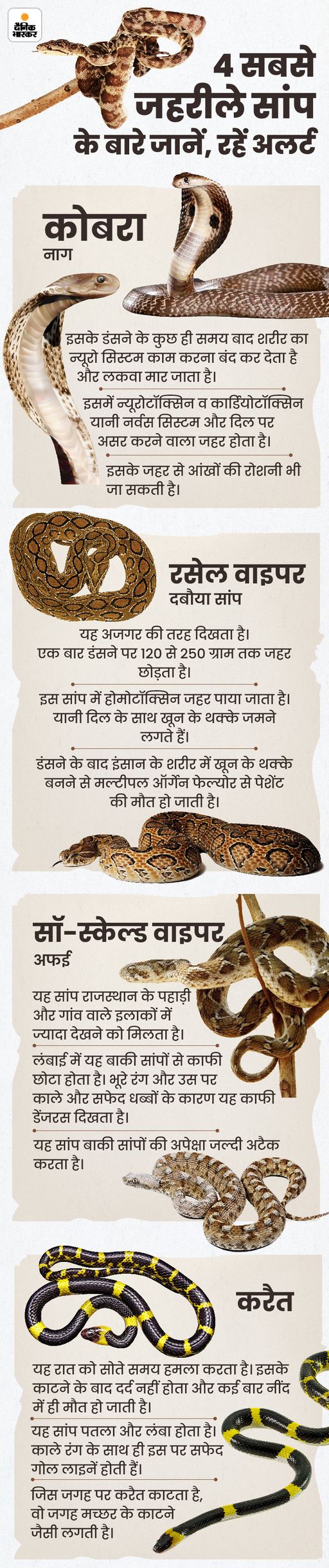 मानसून के दौरान तेज बारिश से सांपों के बिलों या छिपने वाली जगहों में पानी भर जाता है। इससे सांप सूखी और सुरक्षित जगहों की तलाश में बाहर निकलते हैं। इस दौरान वे घर, दुकान और खेत-खलिहान की ओर रुख करते हैं। ऐसे में वे कई बार लोगों को डस लेते हैं। सही जानकारी और थोड़ी सी सावधानी हमें इस खतरे से बचा सकती है। पूरी खबर पढ़ें..