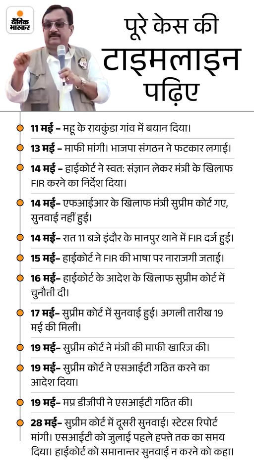 कर्नल सोफिया कुरैशी को आतंकवादियों की बहन बताने के मामले में आज सुप्रीम कोर्ट में एसआईटी स्टेटस रिपोर्ट पेश करेगी। पिछले महीने 28 जुलाई को सुप्रीम कोर्ट ने सुनवाई के दौरान एसआईटी से आज यानी 13 अगस्त तक इस केस की जांच रिपोर्ट पेश करने को कहा था।