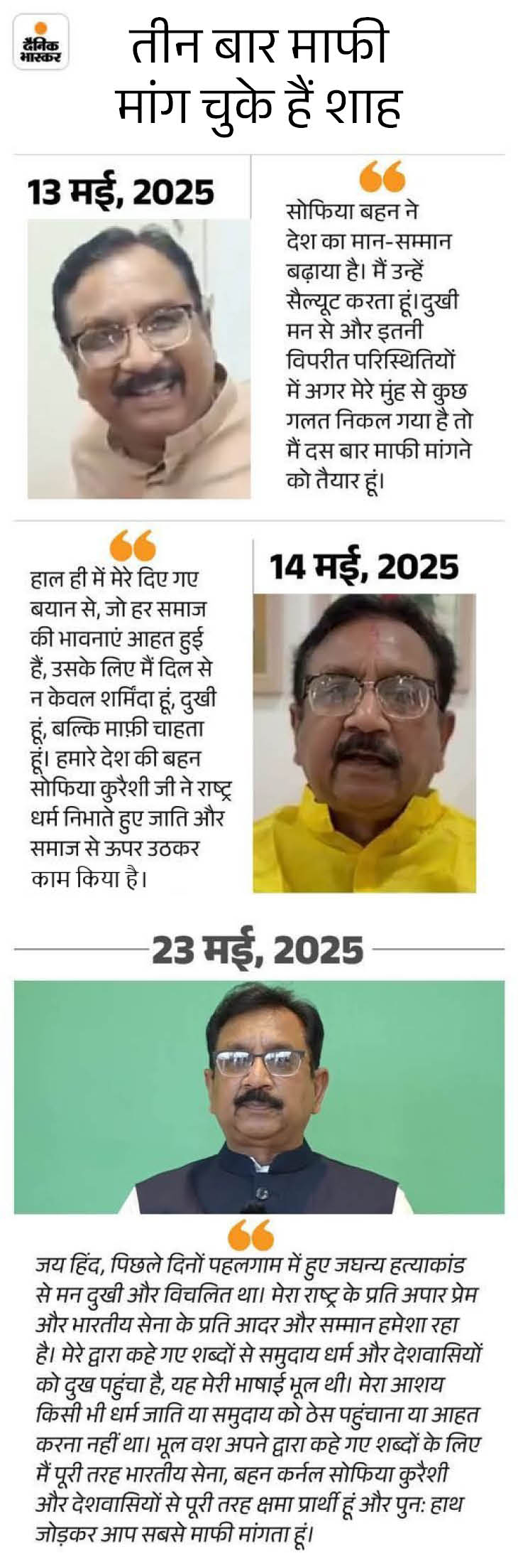शाह को पद से हटाने की याचिका पर सुनवाई से इनकार इस मामले में मंत्री विजय शाह को पद से हटाने की मांग को लेकर कांग्रेस की नेता जया ठाकुर की याचिका पर सुनवाई से सुप्रीम कोर्ट ने इनकार कर दिया। याचिका 23 जुलाई दाखिल की गई थी। कोर्ट ने कहा कि इस याचिका में जो तथ्य विजय शाह को लेकर दिए गए हैं, एसआईटी उन बिंदुओं पर भी जांच करेगी और अपनी रिपोर्ट में देगी।