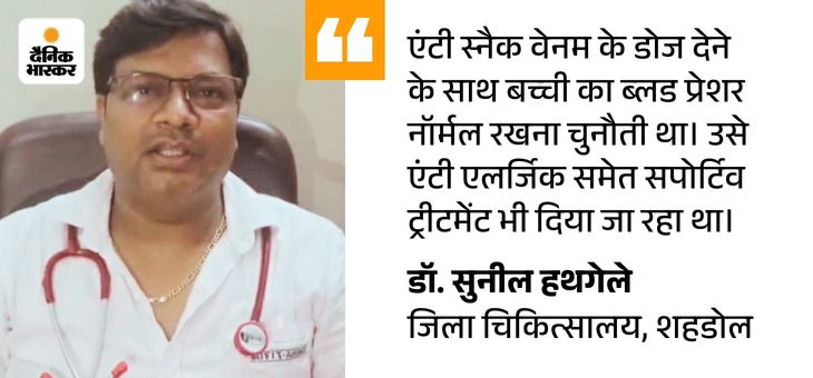10 दिन तक बच्ची ने नहीं किया रिस्पॉन्स डॉ. हथगेले बताते हैं कि सामान्यतः स्नेक बाइट के पेशेंट 5 से 6 दिन में डिस्चार्ज हो जाते हैं। बच्ची ने 10 दिनों तक कोई रिस्पॉन्स नहीं किया। हमने भी उसे वेंटिलेटर सपोर्ट पर रखा था। उसे सारे क्रिटिकल ट्रीटमेंट दिए। इसके बाद भी जब कोई रिस्पॉन्स नहीं मिला तो लगने लगा कि अब ये बच्ची सर्वाइव नहीं कर पाएगी।