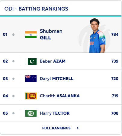 ताजा रैंकिंग में शुभमन गिल 784 अंक के साथ नंबर-1 पर कायम हैं, जबकि बाबर आजम (739 अंक) दूसरे नंबर पर आ गए हें। गिल के अलावा, श्रेयस अय्यर ही दो भारतीय खिलाड़ी हैं जो ODI बल्लेबाज रैंकिंग के टॉप 10 में शामिल हैं।