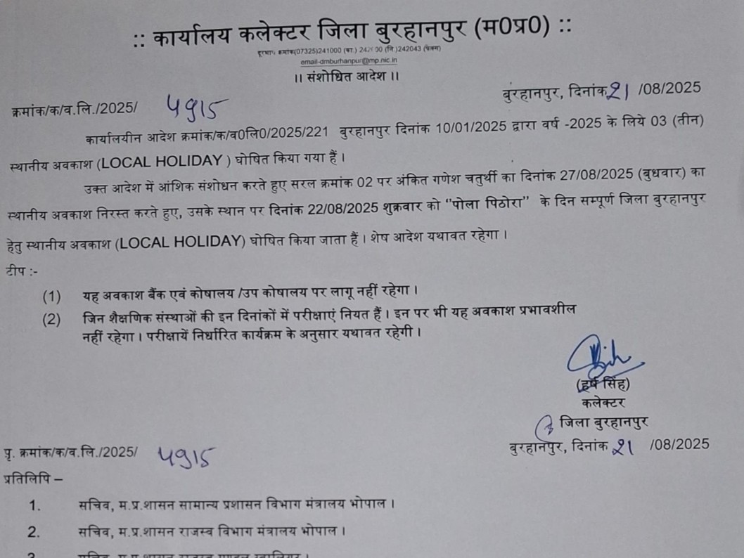 बुरहानपुर जिले में कल (22 अगस्त) पोला पिठोरा पर्व पर स्थानीय अवकाश रहेगा। कलेक्टर हर्ष सिंह ने गुरुवार को इस संबंध में आदेश जारी किए। कलेक्टर ने जनवरी में जारी तीन स्थानीय अवकाश के आदेश में संशोधन किया है।