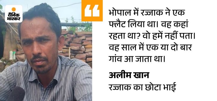 बीस बीघा जमीन, तीनों भाई खेती करते हैं विदिशा जिला मुख्यालय से 30 किमी दूर है रज्जाक का गांव दाऊद बासौदा। करीब 1500 की आबादी वाले गांव में ज्यादातर लोग किसान हैं। रज्जाक के तीनों भाई भी खेती करते हैं। गांव में पहुंचने पर भास्कर की मुलाकात यहां रहने वाले नासिर से हुई। नासिर से रज्जाक के मकान का पता पूछा तो उन्होंने कहा अच्छा सलीम भाई के पास जाना चाहते हैं। वो रज्जाक के बड़े भाई हैं।